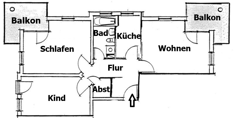 Die helle und gemütliche Wohnung befindet sich im Erdgeschoss des Mehrfamilienhauses. Sie ist aufgeteilt in das Wohnzimmer mit Zugang zum ersten Balkon, Schlafzimmer mit Zugang zum zweiten Balkon, Kinder-/Arbeitszimmer, einer Küche mit Einbaumöbeln (ohne Geräten), sowie dem Bad mit Wanne. Weiteren Stauraum bietet eine Abstellraum im Flur.