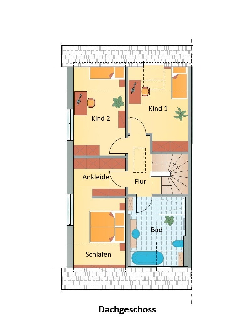 Im Dachgeschoss befinden sich drei Schlafzimmer, sowie ein modernes Badezimmer. Dieses ist mit Badewanne, Dusche, Waschbecken und WC ausgestattet und überzeugt durch eine hochwertige Sanitärausstattung (Duravit & Hansgrohe).
