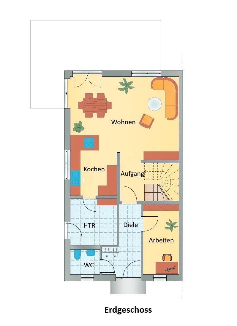 Die Ebene wird durch ein Gäste-WC sowie einen praktischen Hauswirtschafts- bzw. Technikraum ergänzt.